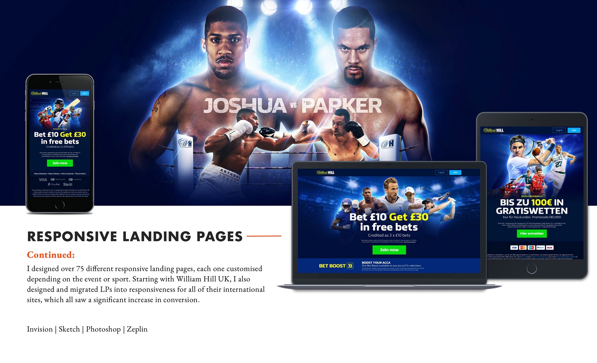 During my time at William Hill, I meticulously crafted and launched more than 75 landing pages, executing a seamless migration process from our previous designs to ensure responsiveness across six distinct breakpoints. Landing pages were created for our parters, specific sports and event pages.