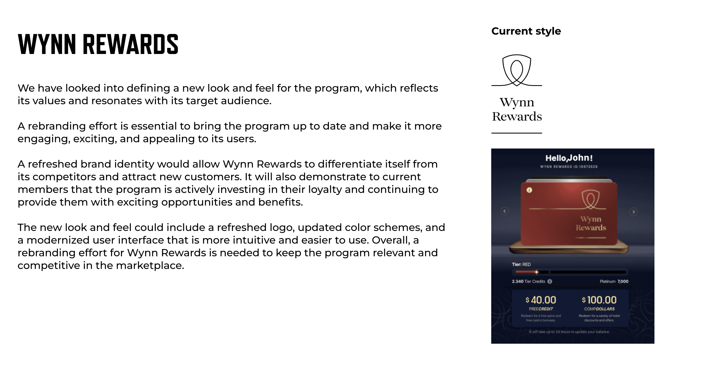 A refreshed brand identity would allow Wynn Rewards to differentiate itself from its competitors and attract new customers. It will also demonstrate to current members that the program is actively investing in their lovalty and continuing to provide them with exciting opportunities and benefits.