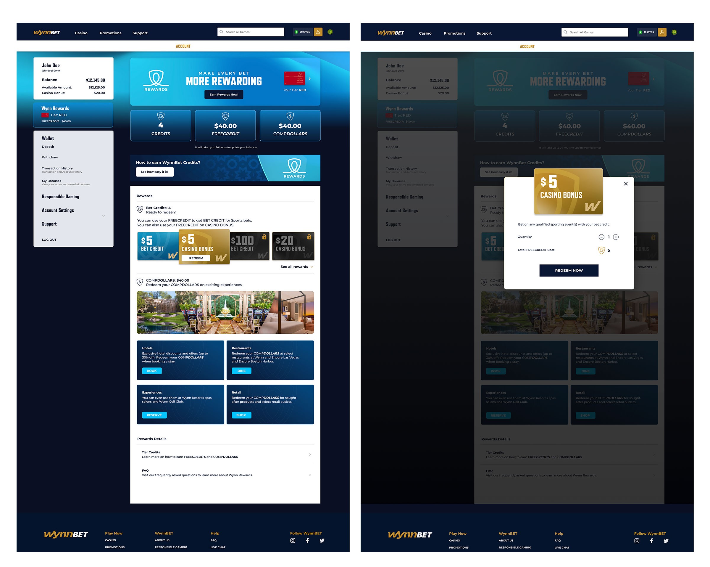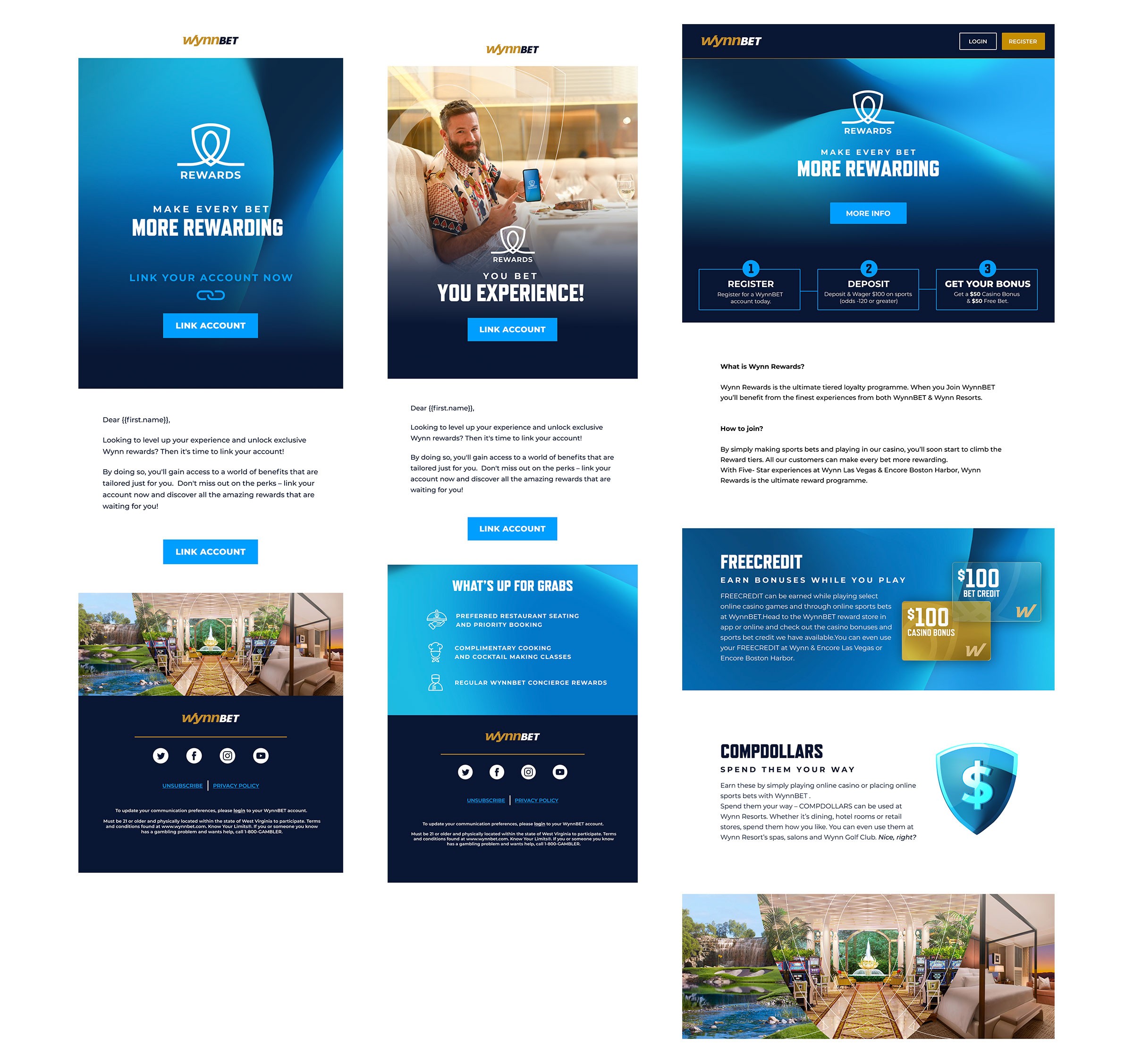 In crafting the UI design for Wynn Rewards, my approach was centred on modernisation and distinction, aligning seamlessly with the overarching brand identity of WynnBet. I proposed a fresh logo design to embody the program's updated values, accompanied by a carefully selected gradient colour palette to elevate its image and foster user engagement. Introducing innovative patterns and textures adds depth and immersion to the visual experience, while new icons simplify complex information, enhancing user-friendliness. Leveraging the brand mark/icon allows for versatile imagery, ensuring a cohesive and captivating interface that resonates with users.